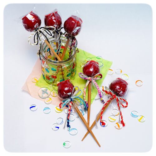 フェイクの姫りんごを、飴のかわりにそのまま樹脂コーティングしています。